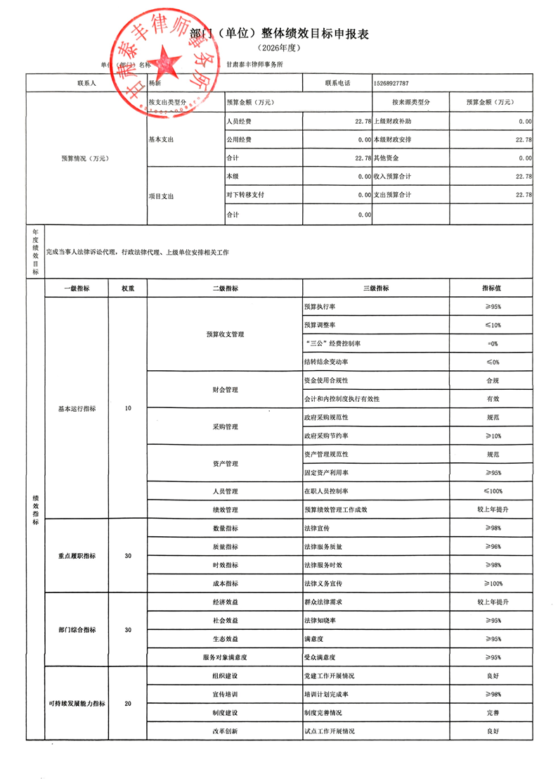 索引号: 62100202000/2026021103691 发布机构: 生效日期: 2026-02-11 废止日期: 文 号: 所属主题: 财政预算决算 甘肃泰丰律师事务所2026年部门预算公开 来源: 发布时间:2026-02-11 浏览次数: 次 【字体:小 大】 【打印正文】 分享到: