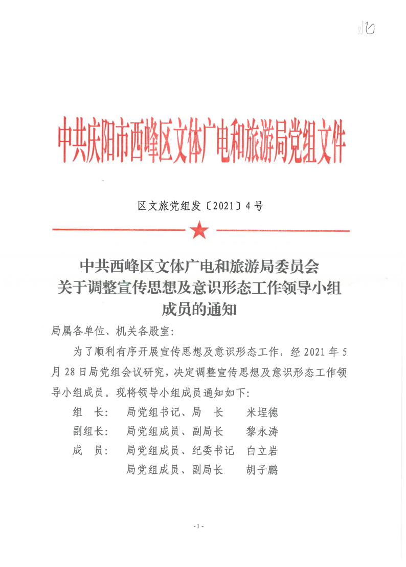 索引号: 3070211020000013000000/2021061000000005 发布机构: 生效日期: 2021-06-10 废止日期: 文 号: 所属主题: 部门文件 关于调整宣传思想及意识形态工作领导小组成员的通知 来源: 发布时间:2021-06-10 浏览次数: 次 【字体:小 大】 【打印正文】 分享到: 【字体:小 大】